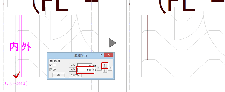 庇の先端をクリックし、「座標入力」ダイアログの「dy」の「180」を確認して「↑」をクリックします。