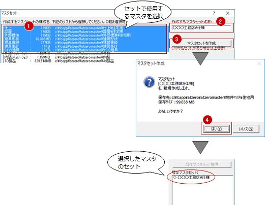 「マスタセット」をクリックして開く「マスタセット」ダイアログで、セットで使用するマスタを選択して登録します。他の物件で、同じマスタセットを使用する場合は、このダイアログを開いて、使用するマスタセットを選択します。