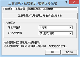 | 工事場所/住居表示から地域を設定する | 「工事場所/住居表示」に入力されている住所から、「地域区分」の「省エネ地域」「パッシブ地域」をセットします。 | |