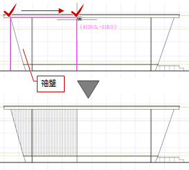 「自動立上」メニューの「部分自動立上」で部分的に再作成してください。 - 「パラペット」「バルコニー手摺」がONの場合、指定した範囲でパラペット、バルコニー手摺も分割されます。