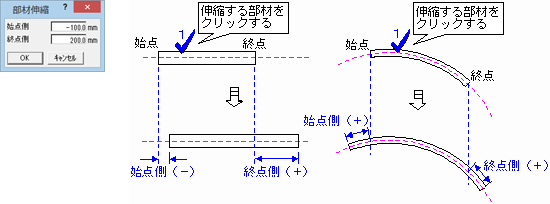 - 「部材伸縮」ダイアログの「始点側」「終点側」に、伸縮する距離を入力して、「OK」をクリックします。