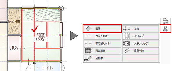 - 畳を選択し、「削除」メニューから「削除」を選び、畳を削除します。