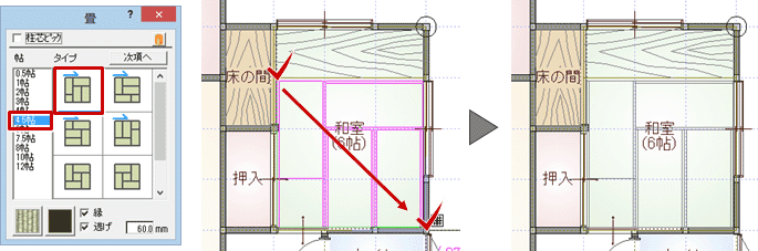 - 「畳」ダイアログの「4.5帖」にあるタイプを選び、畳の範囲を指定します。