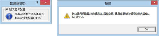 - 「延焼線読込」ダイアログで「防火記号配置」をONにして範囲を指定すると、確認画面が表示されます。「防」マークが配置された建具を防火仕様に変更してください。