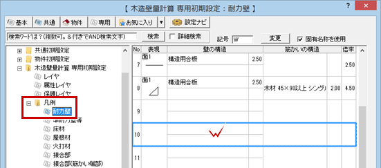 - 「専用初期設定:凡例-耐力壁」を開いて、未登録欄をダブルクリックします。