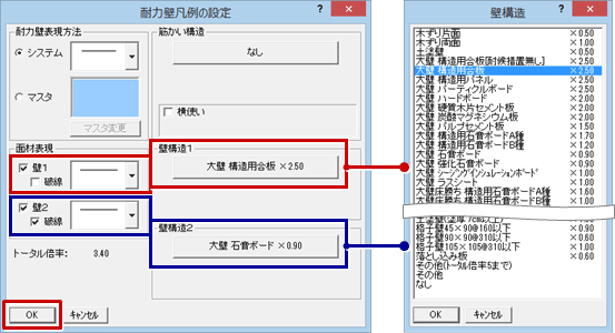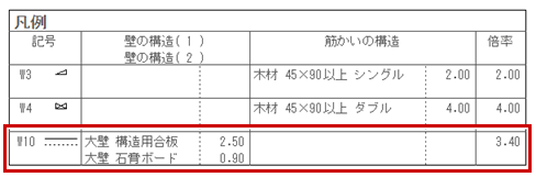 ※ 設定したい面材が「壁構造」ダイアログにない場合は、「その他」または「その他(トータル倍率5まで)」を選んで、壁構造の名称や倍率を設定します。 - 「OK」をクリックすると、凡例に登録されます。