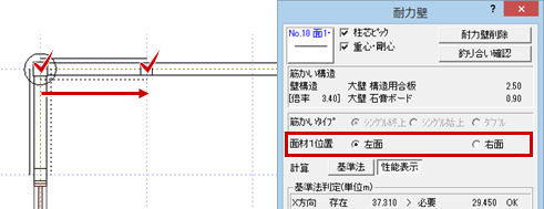 - 面材の位置は、耐力壁の入力時や属性変更時の「面材1位置」で設定します。「壁構造1」の面材記号を、耐力壁の入力方向に対して左側に描画するか、右側に描画するかを選びます。