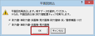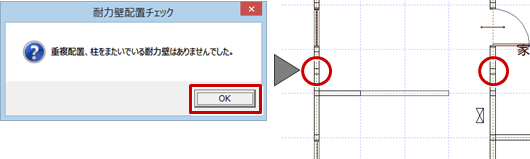 「ツール」メニューの「平面図読み込み」を実行した結果、次の確認画面が表示されます。耐力壁が柱をまたいで配置されていないか、耐力壁が重複して配置されていないかを確認してください。