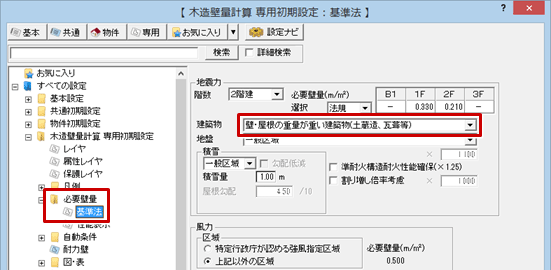 A:「専用初期設定:必要壁量-基準法」の「建築物」は、自動配置する側端部分面積の初期値となるものです。ここで重い屋根、軽い屋根を変更した場合は、再度側端部分面積の自動設定が必要です。