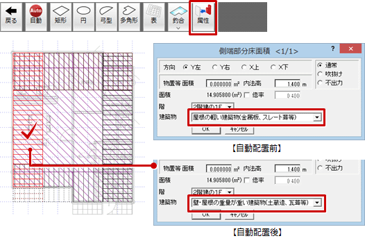 - 「属性変更」をクリックして側端部分面積を選び、「建築物」が変更されたことを確認します。