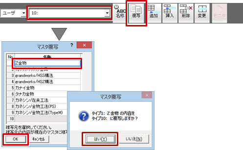 - 「マスタ複写」ダイアログで複写元(ここでは「Z金物」)を選び、「OK」をクリックします。