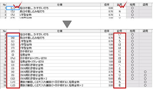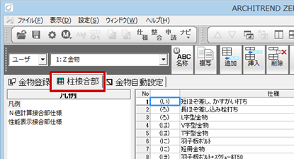 A:柱接合部には、「専用初期設定:凡例-接合部」で設定されている柱頭柱脚の接合部の表記が使用されます。この表記を「い・ろ・は」に変更するには、金物マスタの凡例を変更します。