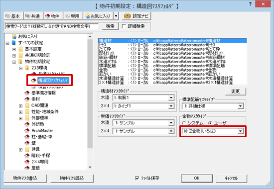 次に、「物件初期設定:マスタ環境-構造図マスタフォルダ」の「金物マスタタイプ」で、使用する金物マスタを指定します。