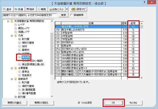 - 「専用初期設定:凡例-接合部」で「記号」が「い」「ろ」「は」になっていることを確認します。