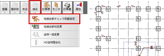 - 2階から「接合」メニューの「柱接合部チェック自動設定」で柱接合部を再設定します。