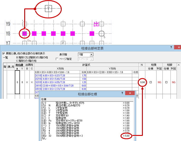 A:接合部仕様の倍率よりも大きな値(N値)の仕様が必要な場合、割り当てる接合部仕様(金物マスタ)が不明となるため、柱に「?」が表示され、判定が「NG」になります。この場合は、次のような対処方法があります。