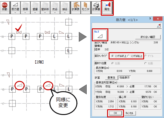 - 「属性変更」をクリックして、2階耐力壁の仕様、タイプを変更します。