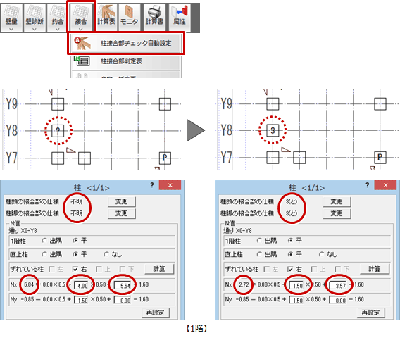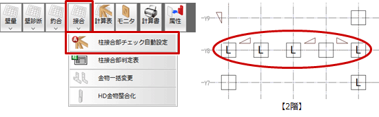 - 「接合」メニューから「柱接合部チェック自動設定」を選び、柱接合部を再設定します。