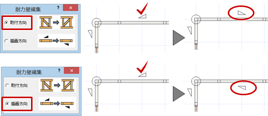 A:「耐力壁」メニューの「耐力壁編集」で筋かいの取り付け方向、描画方向を変更します。