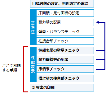 A:基準法モードで壁量・配置バランス・柱接合部チェックをクリアしてから、性能表示モードに切り替えて性能表示の壁量・床倍率チェックを行います。