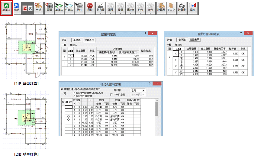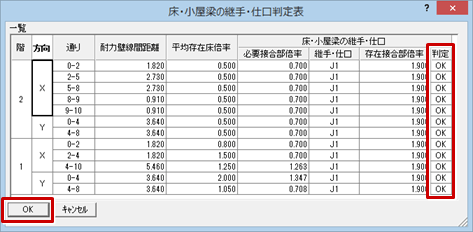 - 各通りの必要接合部倍率、接合部仕様、判定を確認します。