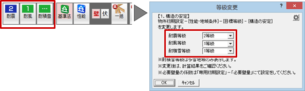 「耐震等級設定」「耐風等級設定」「耐積雪等級設定」をクリックして、「耐震等級」「耐風等級」「耐積雪等級」を設定します。