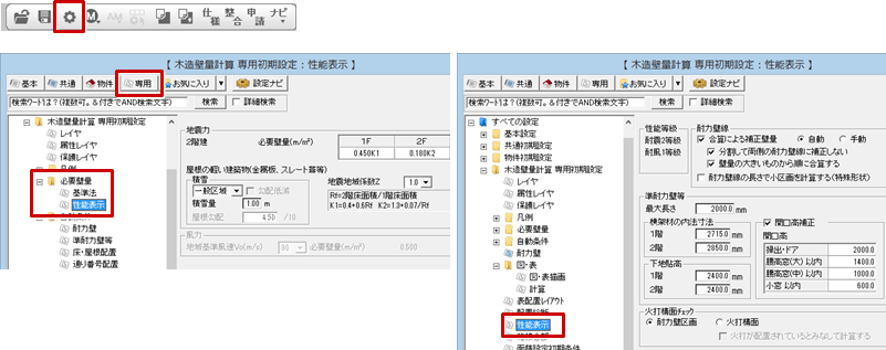 木造壁量計算の「専用初期設定:必要壁量-性能表示」で性能表示の必要壁量の条件、「専用初期設定:性能表示」で性能等級や耐力壁線などの配置条件などを確認します。その他にも「専用初期設定:凡例-床材」など構面で使用する材料、「専用初期設定:自動条件-床・屋根配置」で構面の自動配置の条件などを確認します。