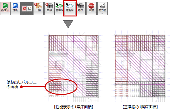 「床面積設定を開く」をクリックして、各階の床面積、側端部分面積を確認します。例えば、はね出しバルコニーがある場合は下階床面積に算入していることを確認します。