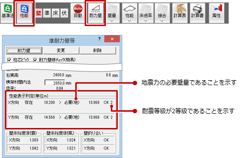 「モード切替(性能表示)」をクリックして性能表示モードに切り替えます。「準耐力壁等」をクリックしてダイアログで性能表示の壁量判定をチェックします。
