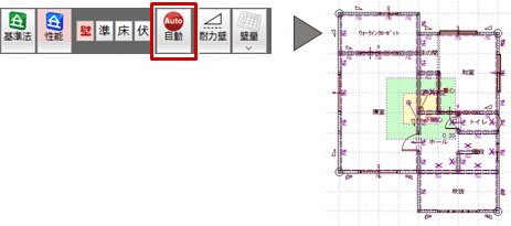 - 性能表示の壁量には準耐力壁等も加算できます。準耐力壁等も加算して検討したいときは、「準耐力壁等自動配置」をクリックします。