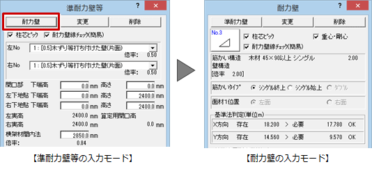 判定がNGの場合は、「準耐力壁等」ダイアログの「耐力壁」をクリックして、耐力壁の入力モードに切り替えてから耐力壁を入力します。耐力壁を追加・変更したら、配置バランス、柱接合部の再設定とチェックを行う必要があります。