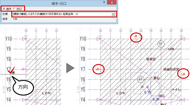 建物外周部の横架材接合部に継手・仕口の仕様を入力します。計算には影響しません。水平構面図で表記が必要な場合に入力します。
