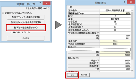 - 計算書に出力される建物諸元表の内容を確認して、「OK」をクリックします。