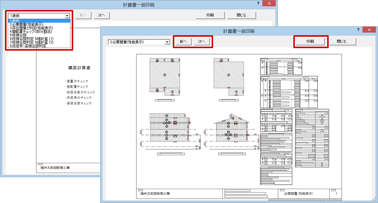 - 一覧から計算書を選んで印刷イメージを確認して、「印刷」をクリックします。