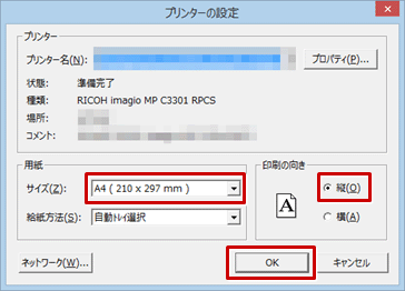 - 「プリンターの設定」ダイアログでプリンターや用紙のサイズ・向きなどを設定して、「OK」をクリックします。