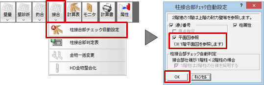 - 「柱接合部チェック自動設定」ダイアログの「平面図参照」をONにして、「OK」をクリックします。