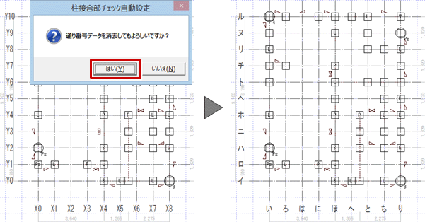 Q:柱接合部の自動設定で作成される通り番号を平面図の通り芯に合わせる方法を教えてください。