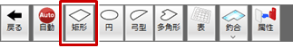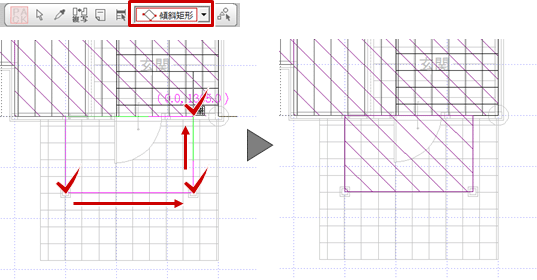 - ここでは、「操作モード切替」を「傾斜矩形」に変更して、床面積の幅と方向を指定します。