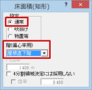 - 「床面積(矩形)」ダイアログの「通常」をON、「階(偏心率用)」を「屋根直下階」に変更します。