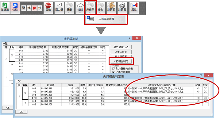 - 「床倍率」メニューの「床倍率判定表」で、床倍率、火打構面の判定を確認します。