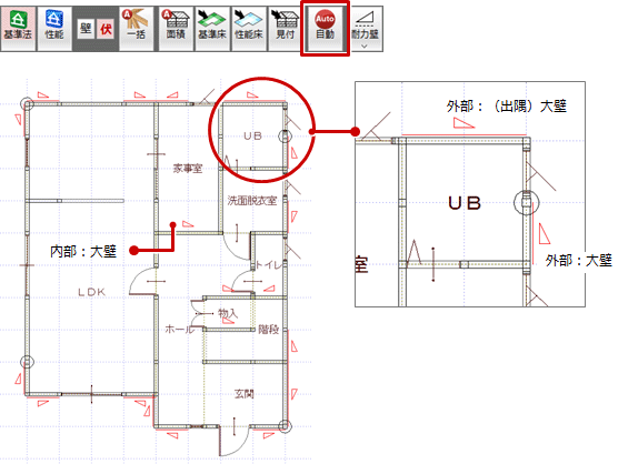 - 「大壁」「(出隅)大壁」などで壁の種類別に配置する耐力壁のタイプを選択します。