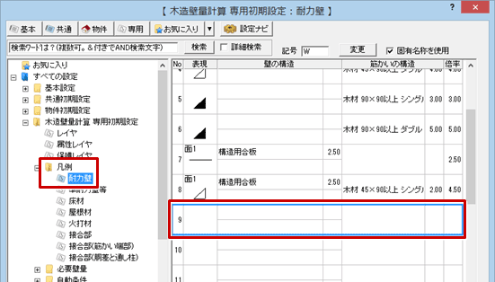 - 手順3で、使用したい耐力壁の凡例がないときは、「専用初期設定:凡例-耐力壁」で凡例を登録します。