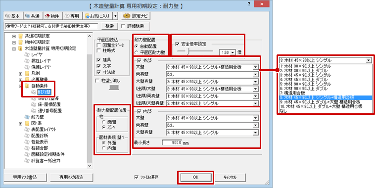 - 「専用初期設定:自動条件-耐力壁」で自動配置の条件を設定します。