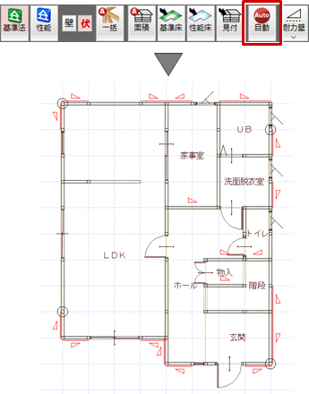 - 「自動立上」をクリックして、耐力壁を自動配置します。