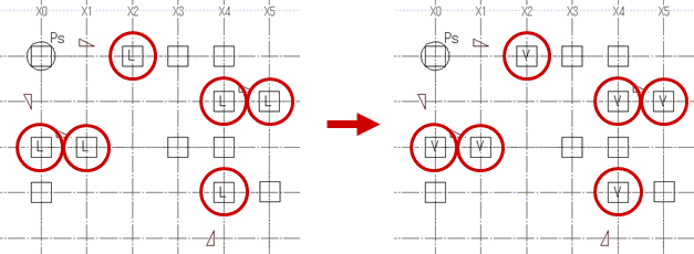 Q:柱の柱頭・柱脚の接合部に取り付けている金物(L→V)をまとめて変更する方法を教えてください。