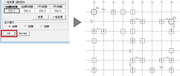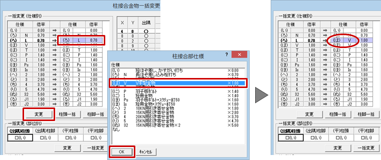 - 「柱接合金物一括変更」ダイアログの「OK」をクリックします。