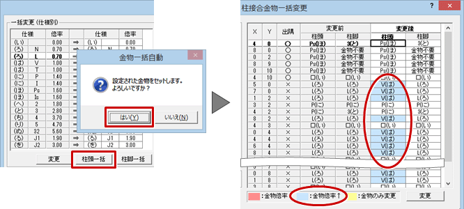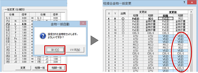 - 続けて、柱脚の金物(L)を金物(V)に変更するときは「柱脚一括」をクリックして、確認画面で「はい」を選びます。