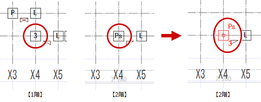 このようなとき、「接合」メニューの「HD金物整合化」を使用して、上下階の同じ位置の柱に同じホールダウン金物を設定します。