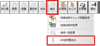 ここでは、2階木造壁量計算を開きます。 - 「接合」メニューから「HD金物整合化」を選びます。