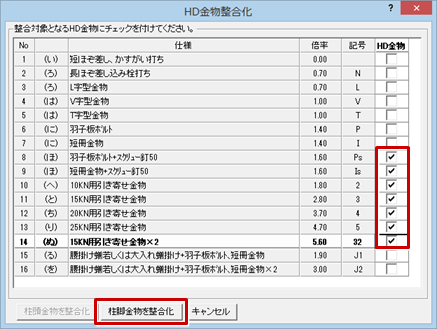 - 「HD金物整合化」ダイアログで、上下階で同じにする金物の「HD金物」をONにします。